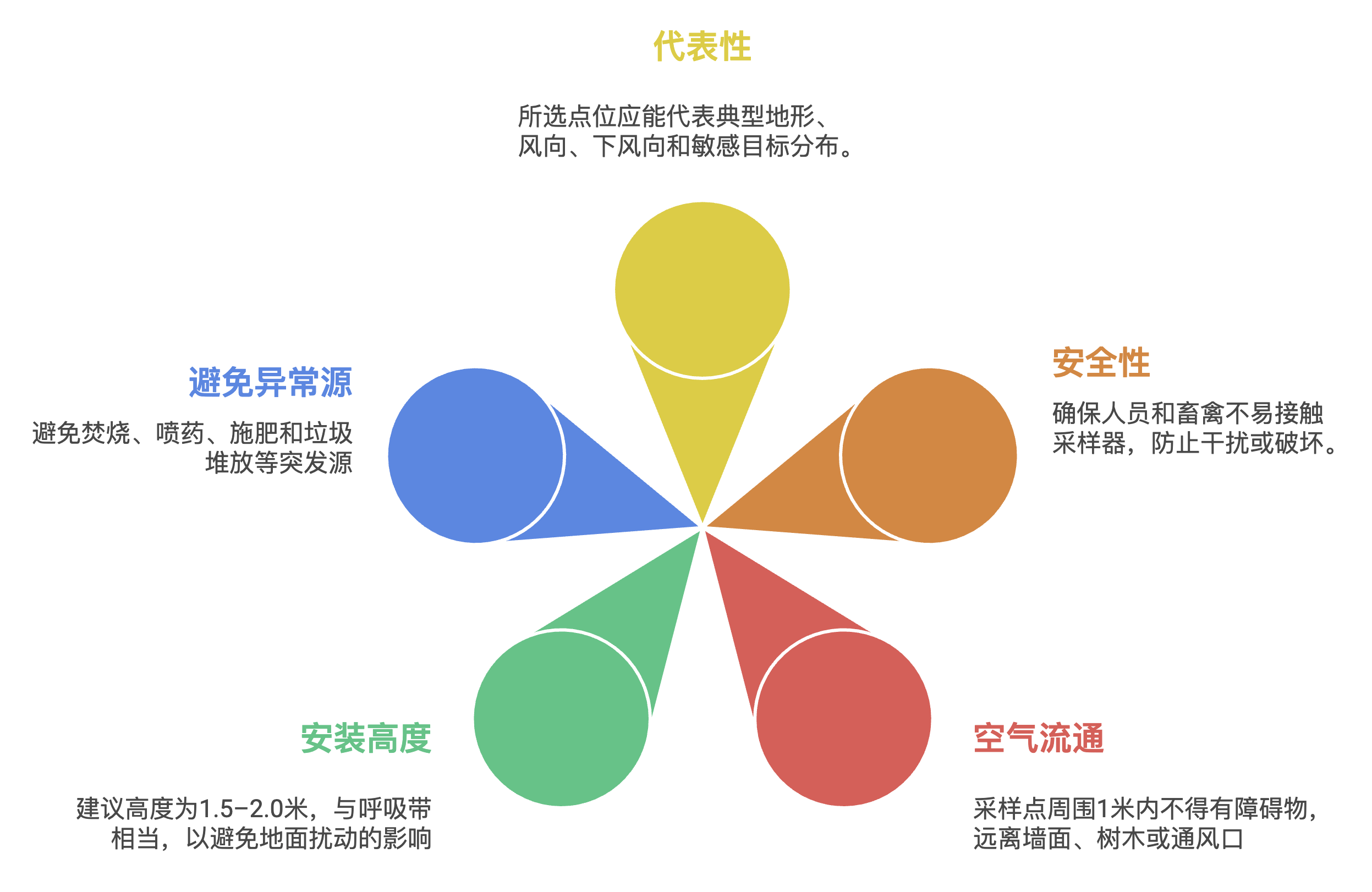在畜禽養(yǎng)殖區(qū)域、鄉(xiāng)村地區(qū)及背景區(qū)開展氨氣監(jiān)測時(shí),被動(dòng)采樣器以其結(jié)構(gòu)簡單、布設(shè)靈活、無需供電的優(yōu)勢,成為環(huán)境空氣監(jiān)測的重要工具。為保證監(jiān)測數(shù)據(jù)具有代表性和可比性,采樣點(diǎn)位的科學(xué)選取和合理布設(shè)至關(guān)重要。