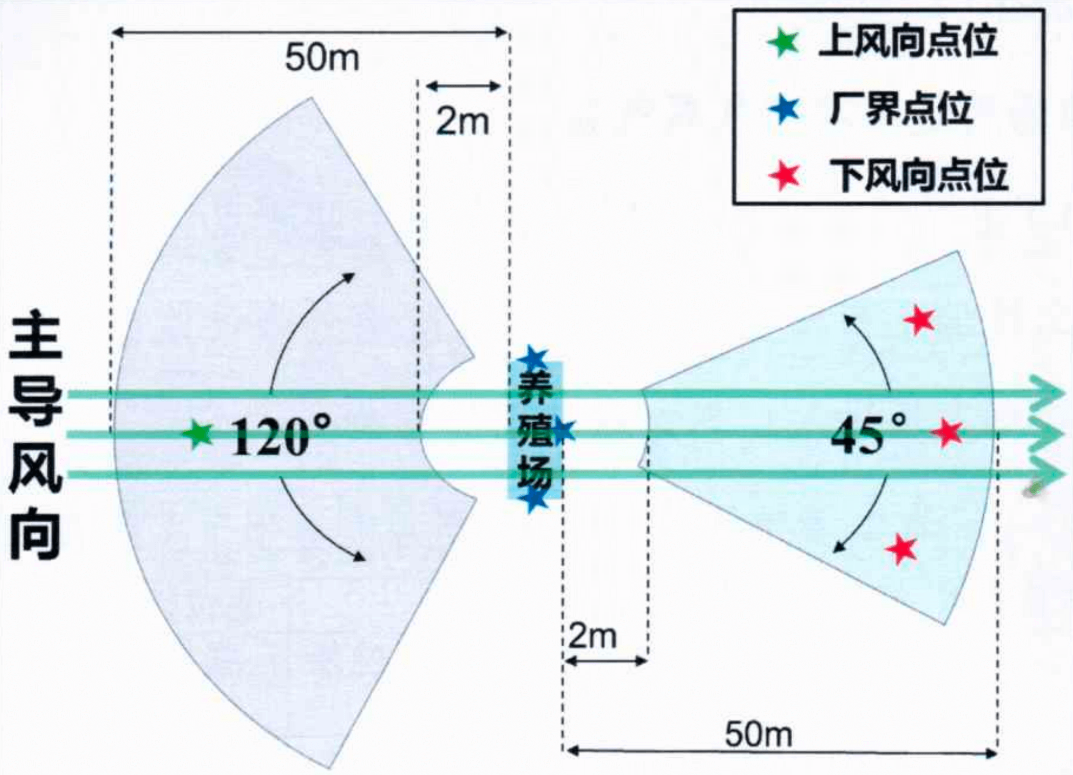 以養(yǎng)殖場主導(dǎo)上風(fēng)向的中線(120°夾角內(nèi),距離養(yǎng)殖場2-50m范圍內(nèi))
