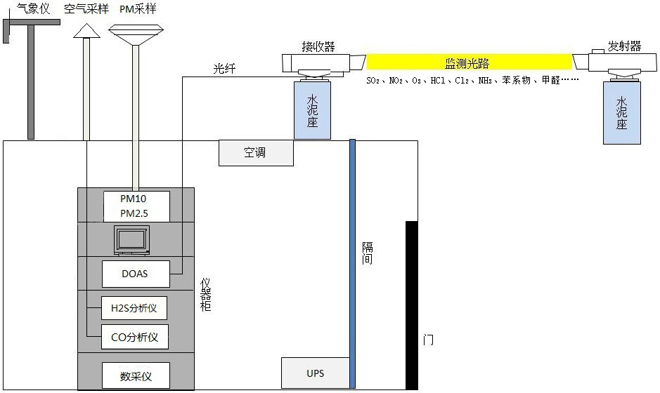 如下圖,在廠界,用開放式光路(長光程)將監(jiān)測區(qū)域/邊界覆蓋,得到光路上各個氣體平均濃度。這樣,只要污染物飄過光路上,則系統(tǒng)均有反應,實現(xiàn)斷面監(jiān)測,避免點式采樣缺陷。