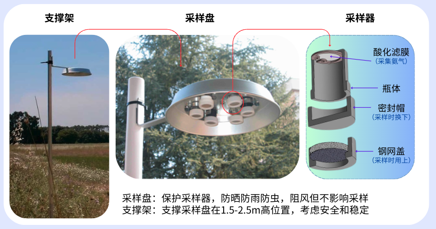 使用被動(dòng)采樣器一般會(huì)涉足到根據(jù)采樣目標(biāo)選購(gòu)被動(dòng)采樣器、布置采樣器(定期派人更換取回)和檢測(cè)分析(氨氣常用離子色譜)等環(huán)節(jié)。整個(gè)被動(dòng)采樣系統(tǒng),一般由支撐架和保護(hù)裝置(比如采樣盤(pán))和采樣器組成。