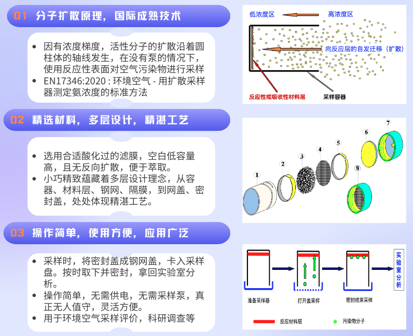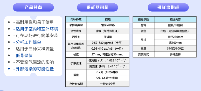 【關(guān)鍵點(diǎn)】:意大利Analyst?品牌,環(huán)境空氣或畜牧場(chǎng)氨氣的被動(dòng)式采樣,低成本,體積小,無(wú)需電和采樣泵,操作方便,靈敏度可達(dá)1μg/m3。