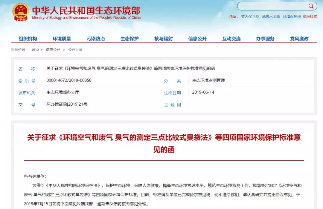 2019614日,生態(tài)環(huán)境部發(fā)布關(guān)于征求《環(huán)境空氣和廢氣 臭氣的測定三點比較式臭袋法》等四項國家環(huán)境保護標準意見的函”: