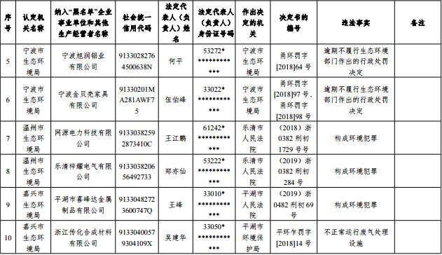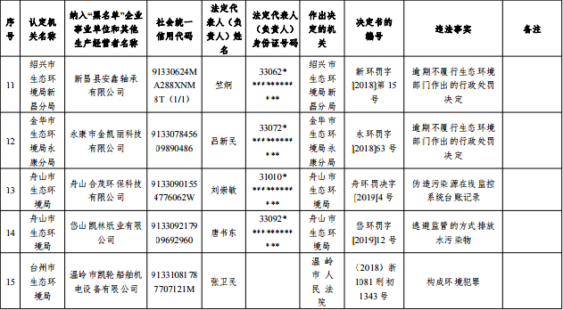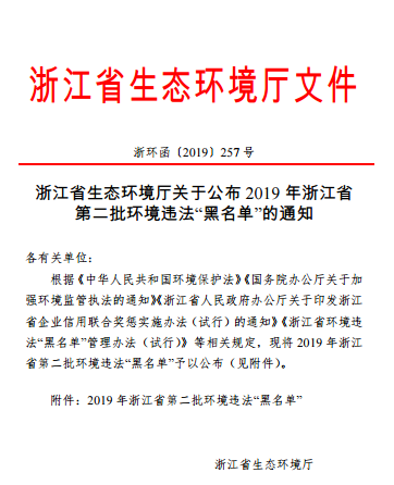 根據(jù)《中華人民共和國環(huán)境保護法》《國務院辦公廳關于加強環(huán)境監(jiān)管執(zhí)法的通知》《浙江省人民政府辦公廳關于印發(fā)浙江省企業(yè)信用聯(lián)合獎懲實施辦法(試行)的通知》《浙江省環(huán)境違法“黑名單”管理辦法(試行)》等相關規(guī)定,現(xiàn)將2019年浙江省第二批環(huán)境違法“黑名單”予以公布。詳情如下: