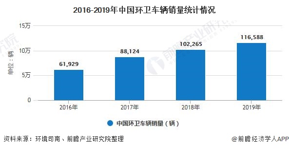根據中國銀行保險監督管理委員會的新車交強險統計數據,2019年全國環衛車輛銷量116588輛,同比增長14.01%,近三年復合增長率為23.48%,同比增速有所減緩,環衛裝備行業進入了穩步增長時期。