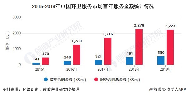 環衛服務市場化改革之初至目前成為必然的發展趨勢,據環境司南不完全統計,2019年全國各地新簽環衛服務合同總金額為2223億元,同比略降2.41%,首年合同金額為550億元,同比增長12.02%。