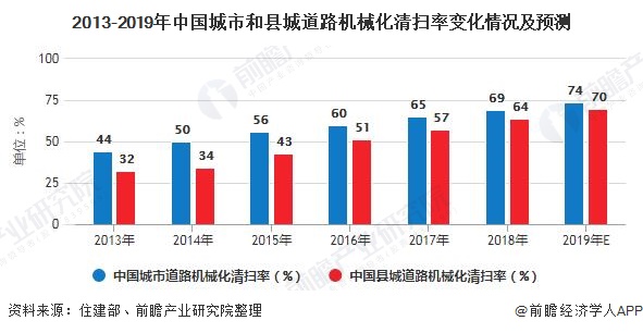 環保行業智慧化趨勢明顯。根據住建部《中國城鄉建設統計年鑒》各年統計數據,我國城市和縣城道路的機械化清掃率不斷提升,2018年分別達到69%、64%,初步估計2019年達到74%和70%。