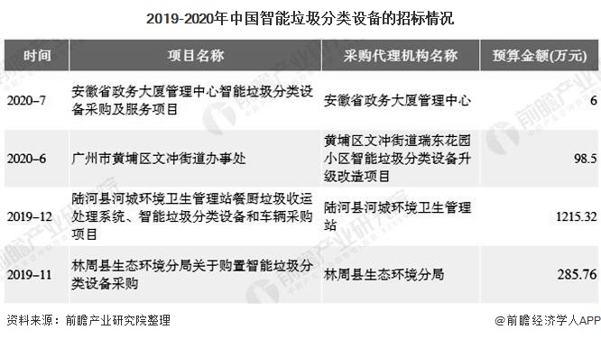 隨著垃圾分類、鄉村振興、農村人居環境整治等利好政策的落地執行,為環衛裝備,特別是垃圾分類裝備帶來了增量。但是智能垃圾分類設備一般金額較大,從招標情況來看,智能垃圾分類設備的招標總量金額較大。